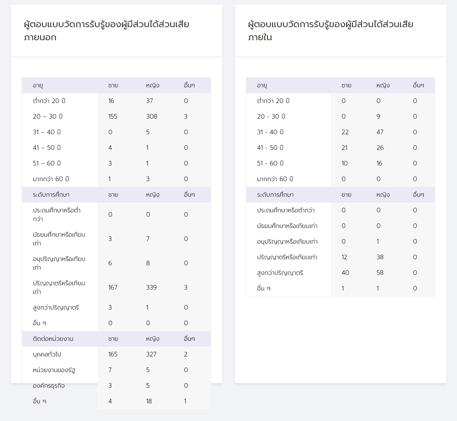 ผลการประเมินคุณธรรมและความโปร่งใสฯ (ITA) ปีงบประมาณ พ.ศ. 2564 (รายละเอียดข้อมูลจากระบบ ITA System) ผลคะแนน IIT EIT และ OIT IIT : 1 การปฏิบัติหน้าที่IIT : 2 การใช้งบประมาณIIT : 3 การใช้อำนาจIIT : 4 การใช้ทรัพย์สินของราชการIIT : 5 การแก้ไขปัญหาการทุจริตEIT: 6 คุณภาพการดำเนินงานEIT: 7 ประสิทธิภาพการสื่อสารEIT: 8 การปรับปรุงการทำงานOIT : 9 การเปิดเผยข้อมูลOIT : 10 การป้องกันการทุจริต ข้อมูลผู้ตอบแบบวัดการรับรู้ของผู้มีส่วนได้ส่วนเสียภายใน (IIT) และภายนอก (EIT)